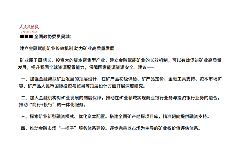 全國(guó)政協(xié)委員吳城:建立金融賦能礦業(yè)長(zhǎng)效機(jī)制 助力礦業(yè)高質(zhì)量發(fā)展